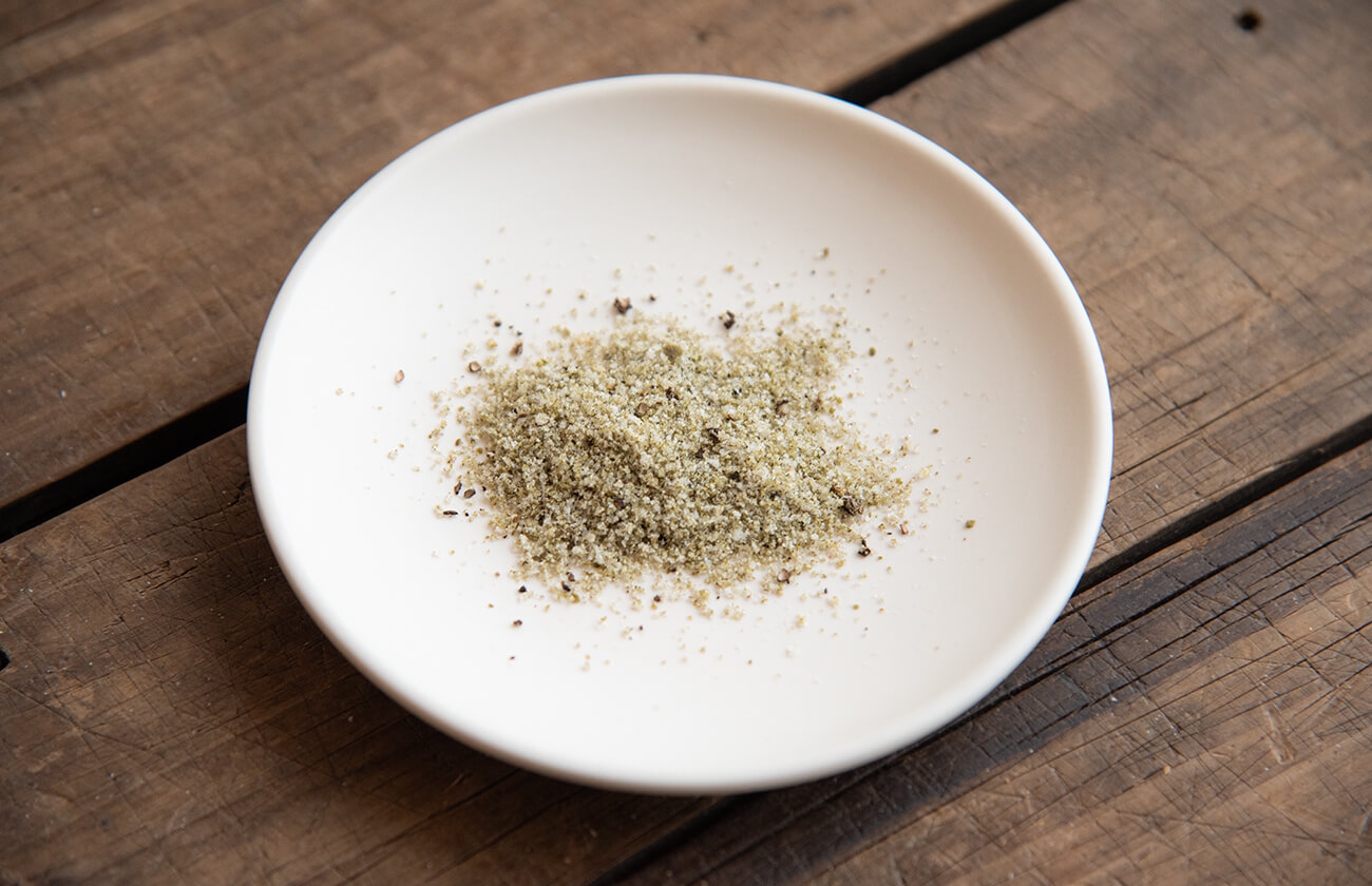 天草の海から作られた海水塩と島原昆布粉末、鹿児島産青パパイヤの種をブレンドした旨味の詰まった味わい深いシーズニングソルト。きくち村でも販売している「小さな海」という煎熬塩(せんごうえん)は、濃縮された天草の海水を鉄釜を用いて薪で炊き上げる昔ながら手法で作られています。ただ塩からいだけではない、ほのかな苦味や甘味があり、ミネラルをも多く含みます。この煎熬塩をベースに、旨味の詰まった島原昆布を粉末にしたもの、そして鹿児島産の自然栽培青パパイヤの種をブレンドしています。